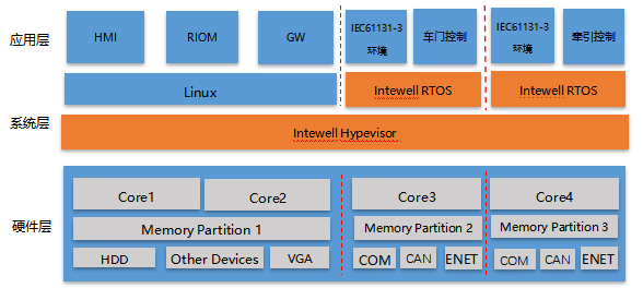 Intewell操作系统基于微内核的虚拟化手艺,构建了列车控制系统的底层手艺平台。如下图所示,Intewell对上承载基础控制软件及面向轨交的行业应用软件,支持智能化应用,对下兼容种种硬件装备和处置惩罚器,支持WTB/MVB/CAN总线及以太网通讯。